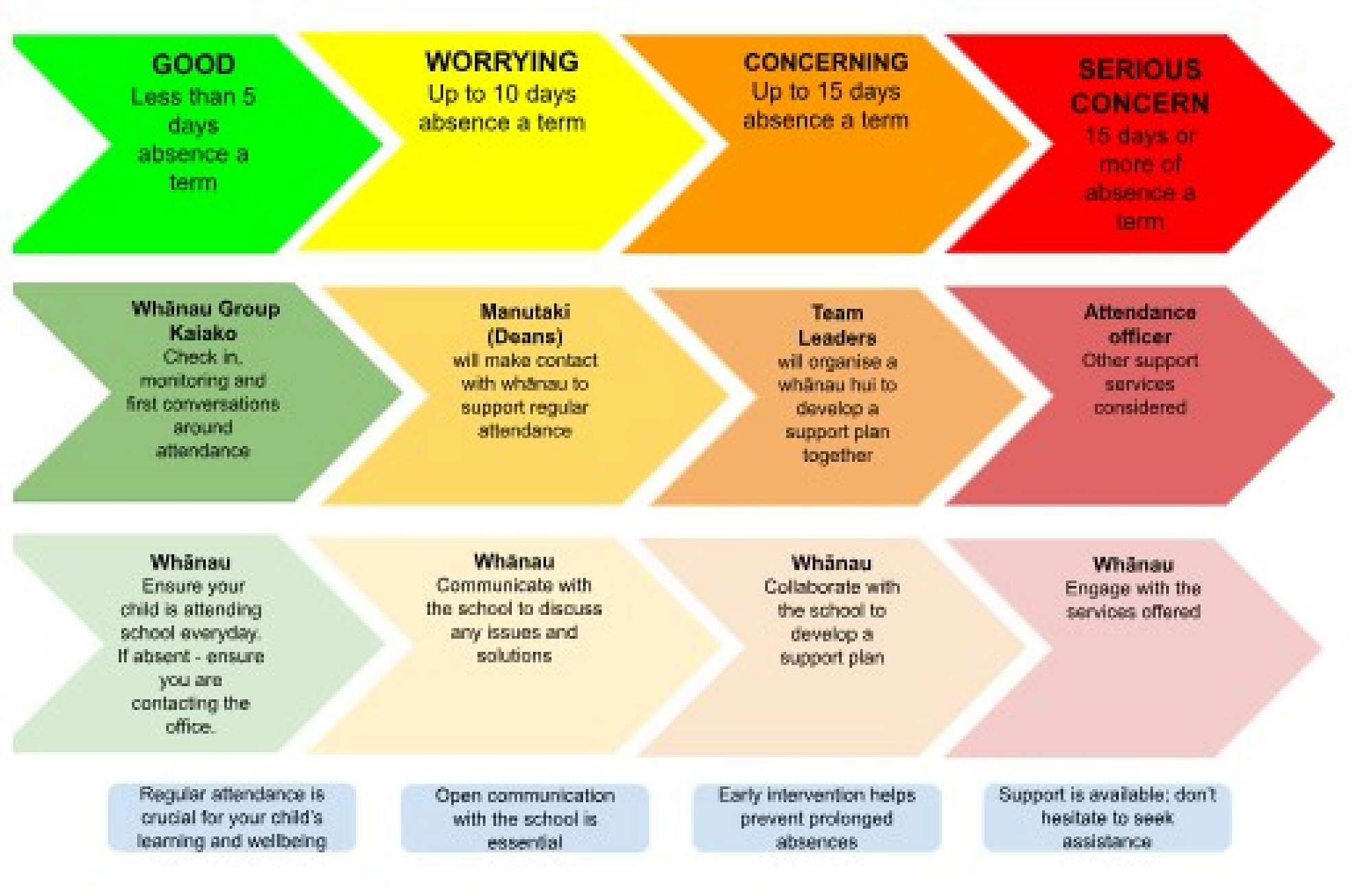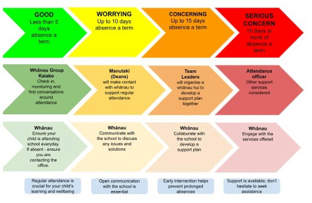 Each week, parents and caregivers will receive an automated email outlining their child’s attendance statistics. This notification will also highlight attendance patterns in line with the Ministry’s stepped attendance response system, allowing staff, parents, and key support people to monitor attendance, work together, and ensure student attendance is tracked and positive outcomes are achieved. How to report absences here.